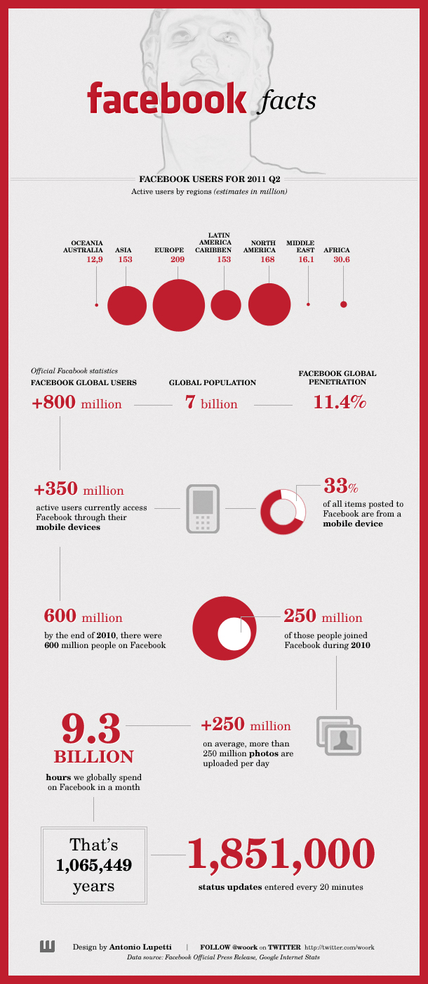 Este dato sorprendente, y algunos más, han sido revelados recientemente en un estudio publicado en Internet. La red social de Mark Zuckerberg, creada hace sólo siete años y presente en Europa desde hace únicamente cuatro, cuenta ya en este año 2011 con 800 millones de usuarios en el mundo. Si tenemos en cuenta que la población mundial llegó recientemente a los 7 billones, obtenemos el resultado cabecera de este artículo: el 11.4% de la población mundial tiene un perfil social en esta web.
